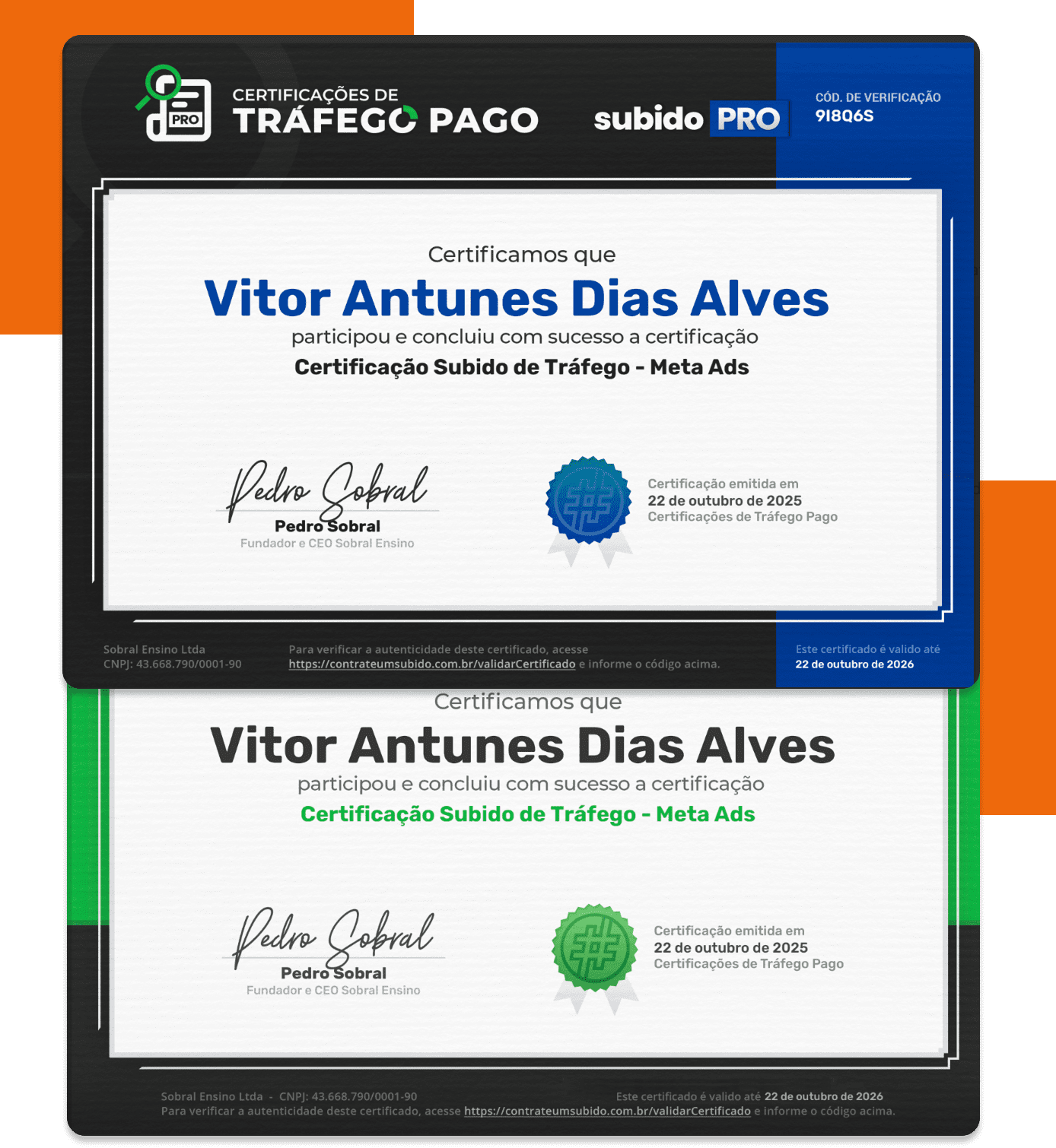 Tenho formação pela Comunidade Subido e faço parte do Subido PRO, onde aplico métodos validados de estrutura de campanhas, otimização contínua e leitura de métricas.
